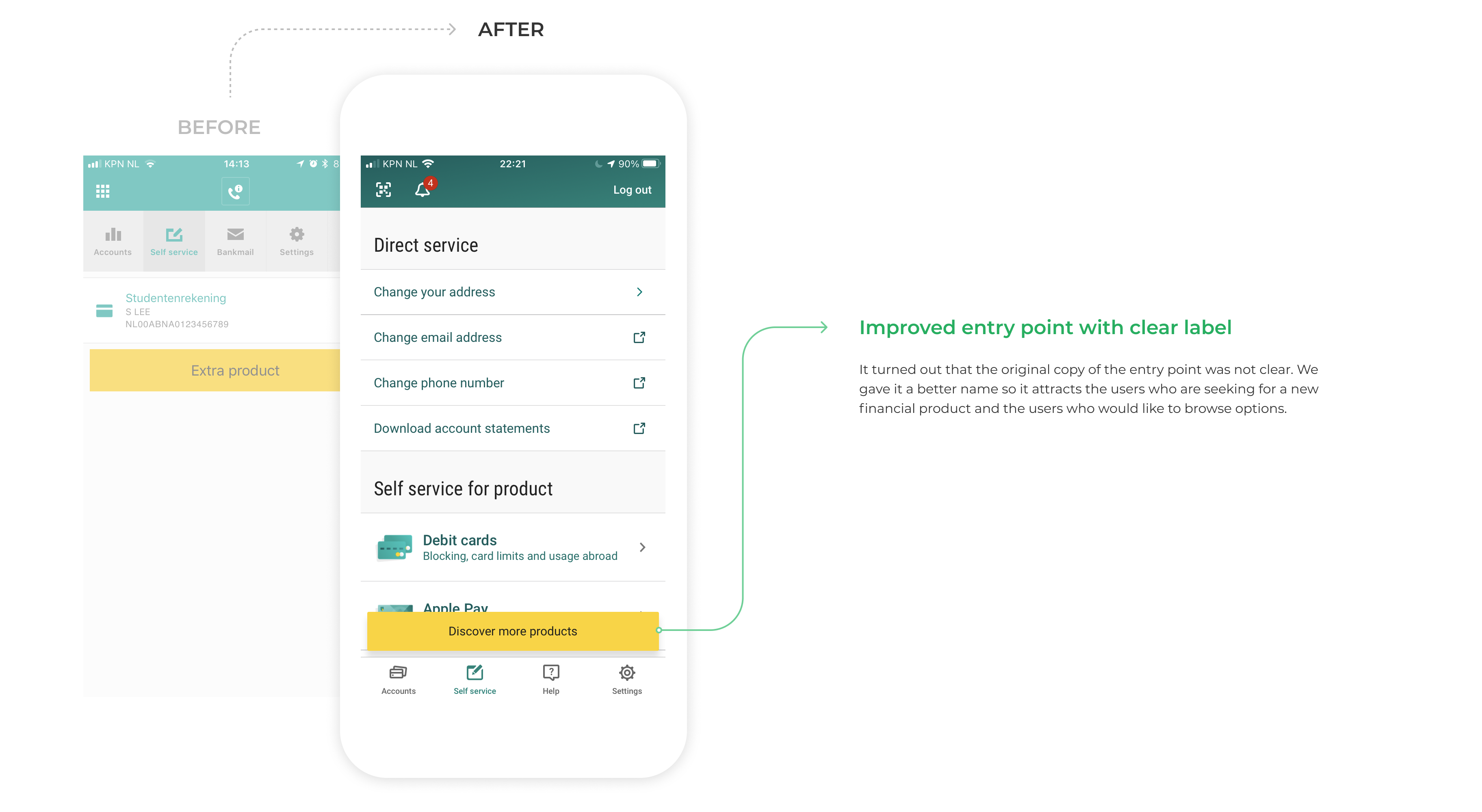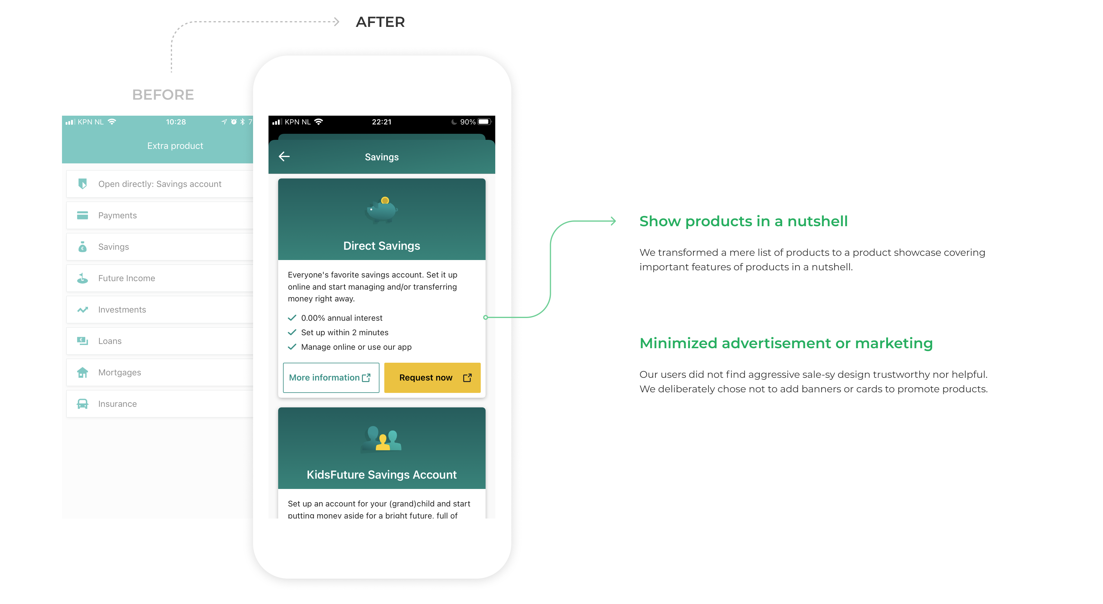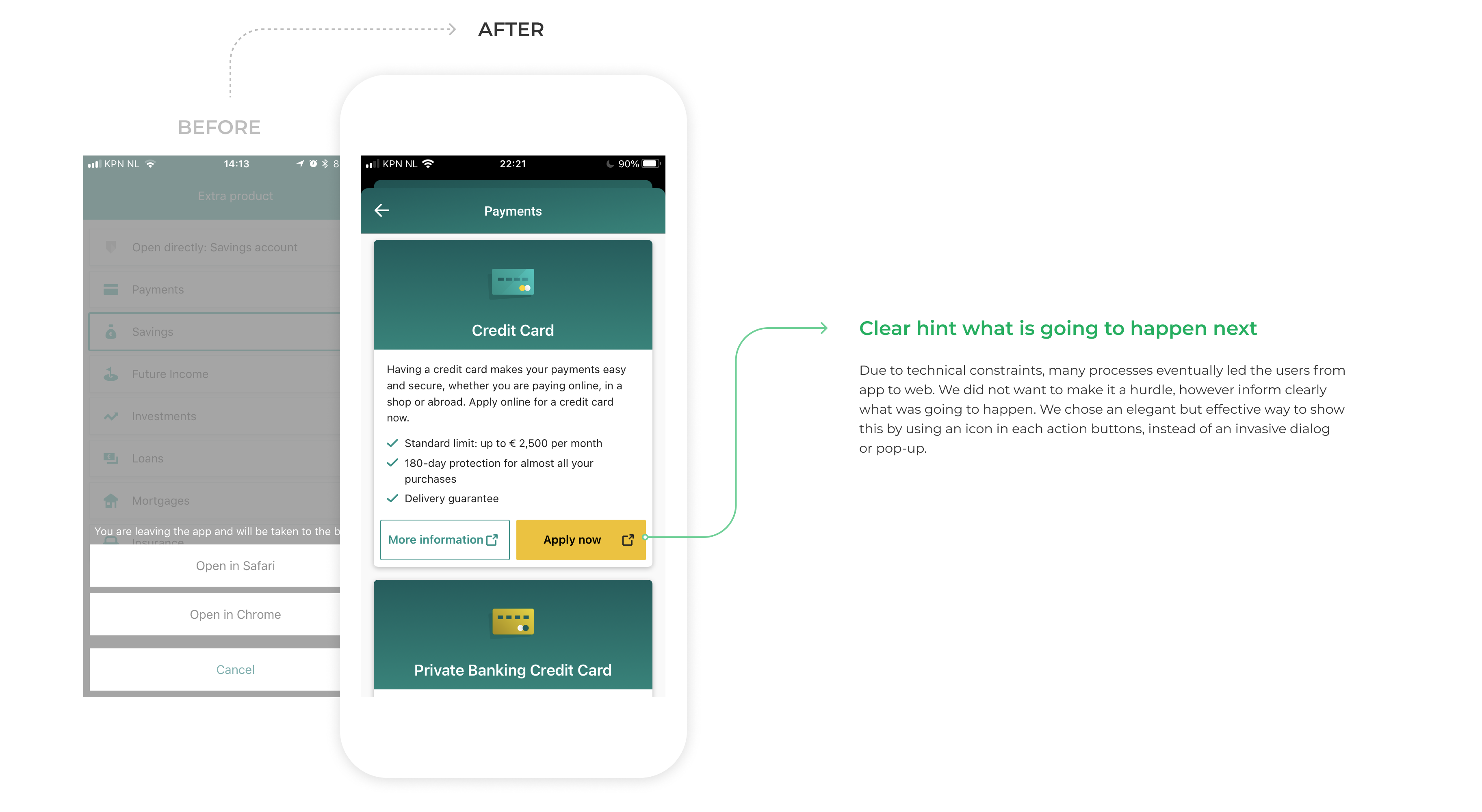The ABN Amro's mobile banking app showed at least 5 to 20% lower conversion rate when compared to that of the internet banking for the same product offering. The project to improve this was on-hold despite the targets, strategies and designs that had been created because it was difficult to reach an agreement between multiple stakeholders.