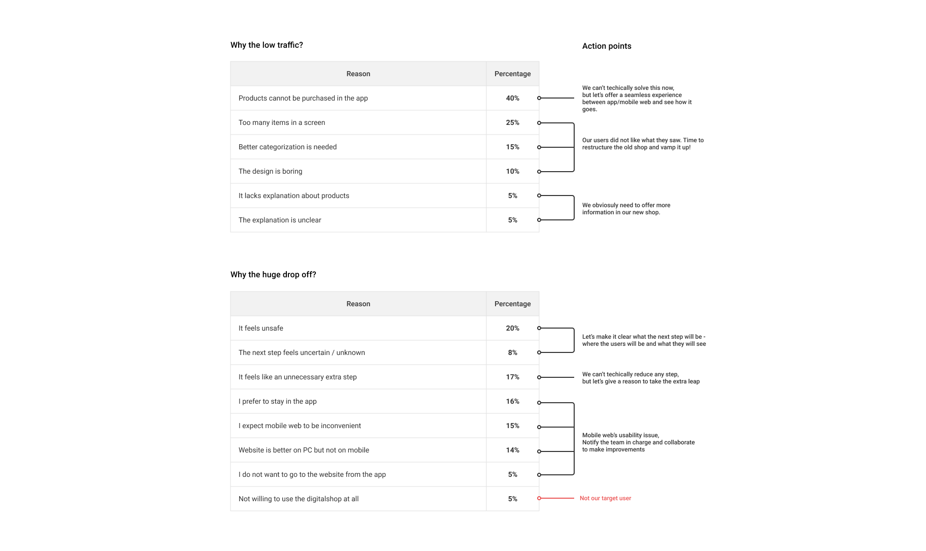 • What are the causes of the low traffic and the huge drop-off rate?
